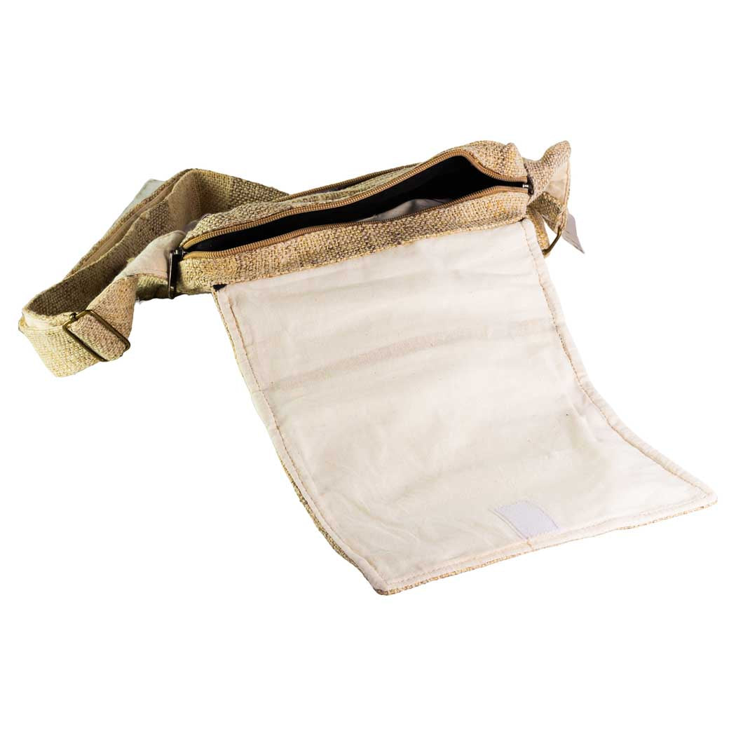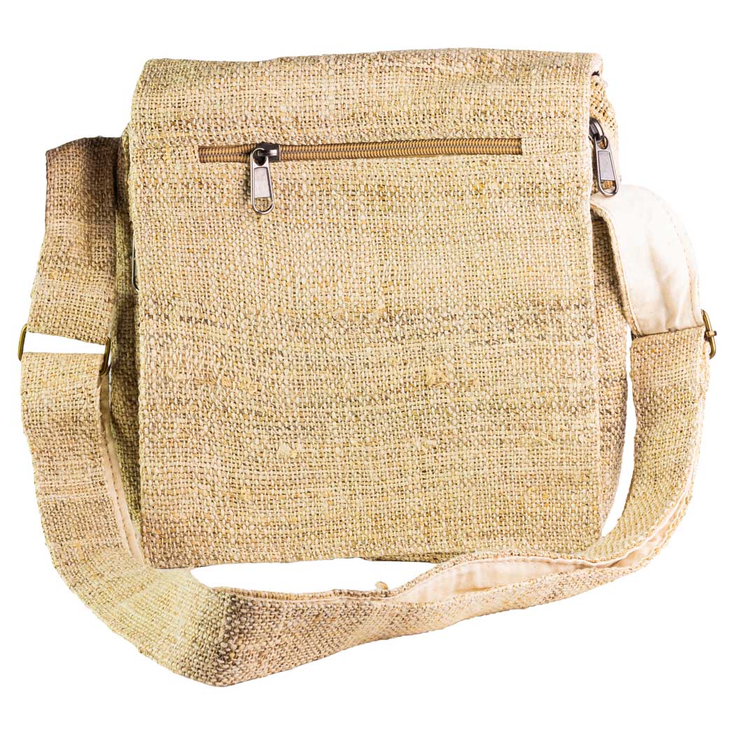 A sturdy, rustic messenger bag made from hemp that keeps essentials organized and looks great doing it. The lined main compartment offers protection while the flap hides a zippered pocket and features an extra easy-access zippered pocket on the front for quick grabs.