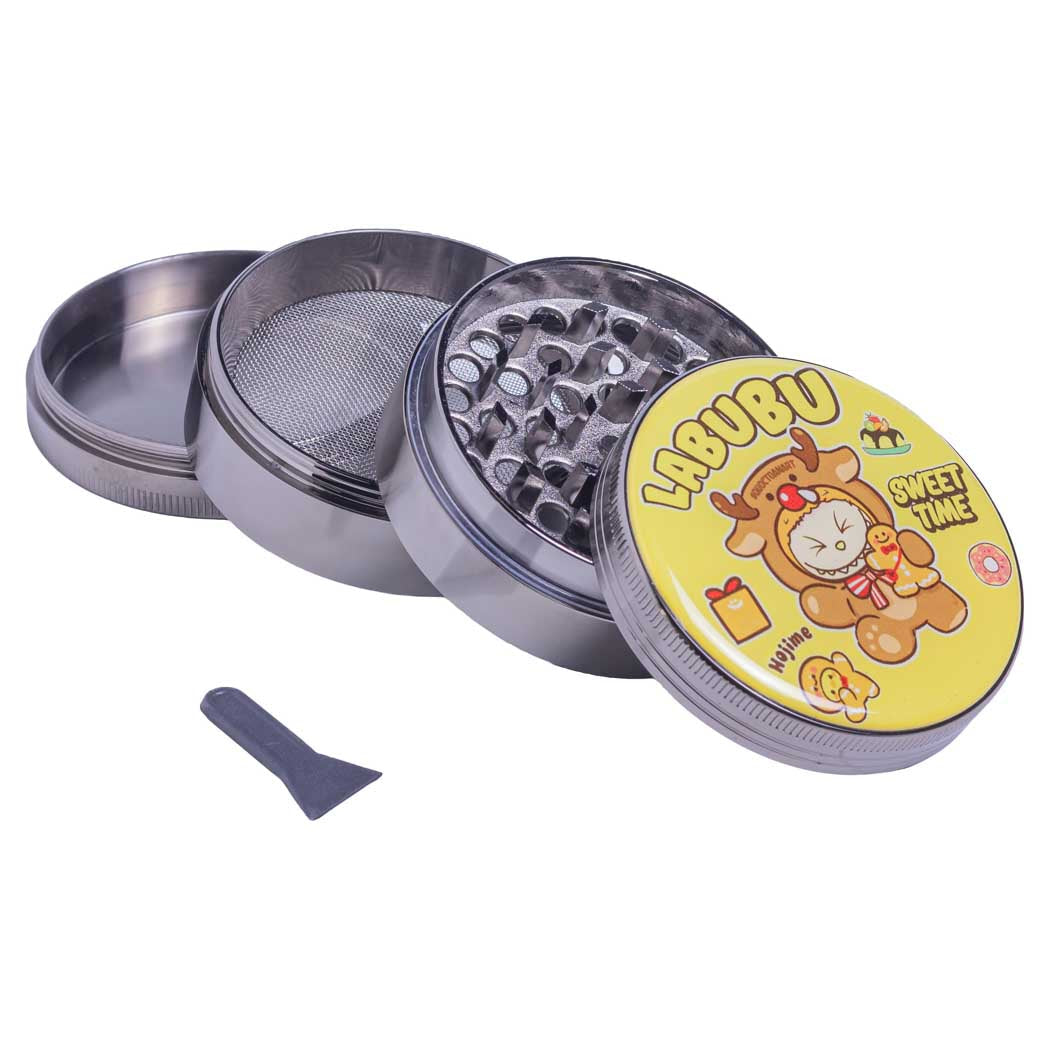 This 63mm heavy metal grinder features assorted character face lid designs and a textured grip ring for effortless handling. Built with a 4-piece structure, it includes diamond-shaped cutting teeth, a bottom screen for pollen collection, and a pollen scraper tool for maximum convenience.