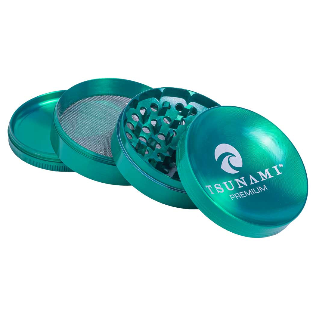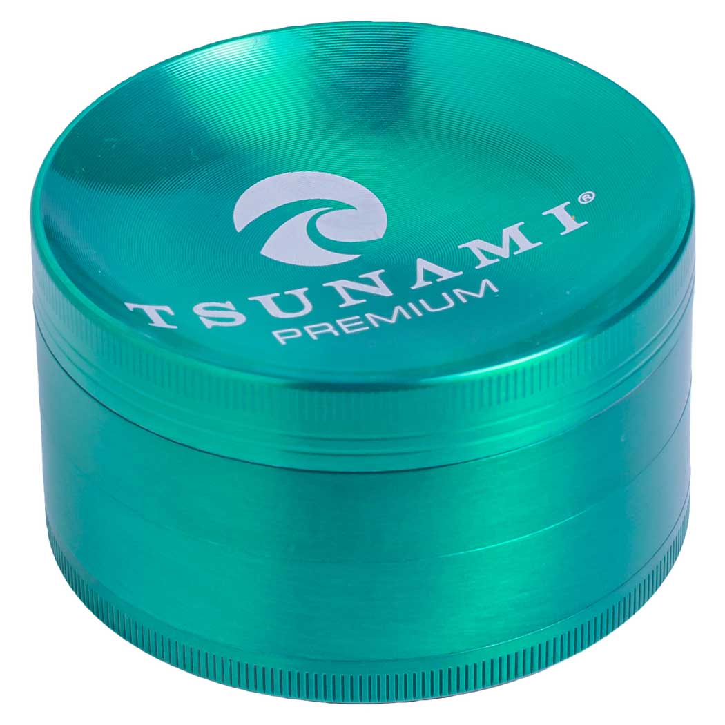 The TSUNAMI Caved-Top 75mm metal grinder features a textured caved-top lid for enhanced grip and a robust 4-piece design for precise herb shredding. At 75mm diameter and 1.75" height, it includes diamond-shaped cutting teeth, a mesh screen for pollen collection, and a bottom chamber with a pollen scraper tool—all in assorted metallic colors.