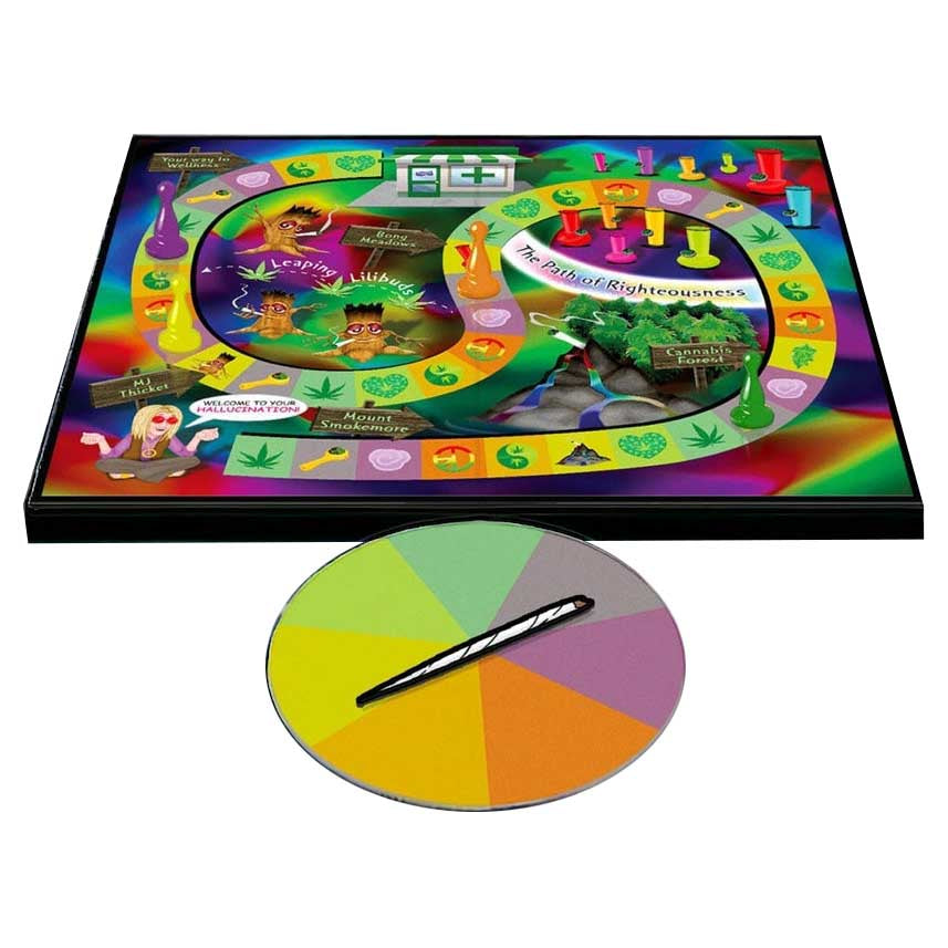 Take a psychedelic trip through board-game absurdity with this pot-themed party game that mixes dares, challenges, and a joint-shaped spinner for goofy, stoned fun; easy to learn and perfect for game nights or seshes, the goal is to be the first player to reach the marijuana clinic while surviving ridiculous weed-themed obstacles.