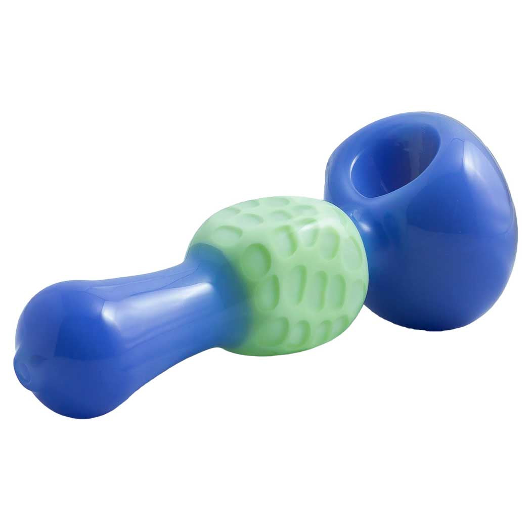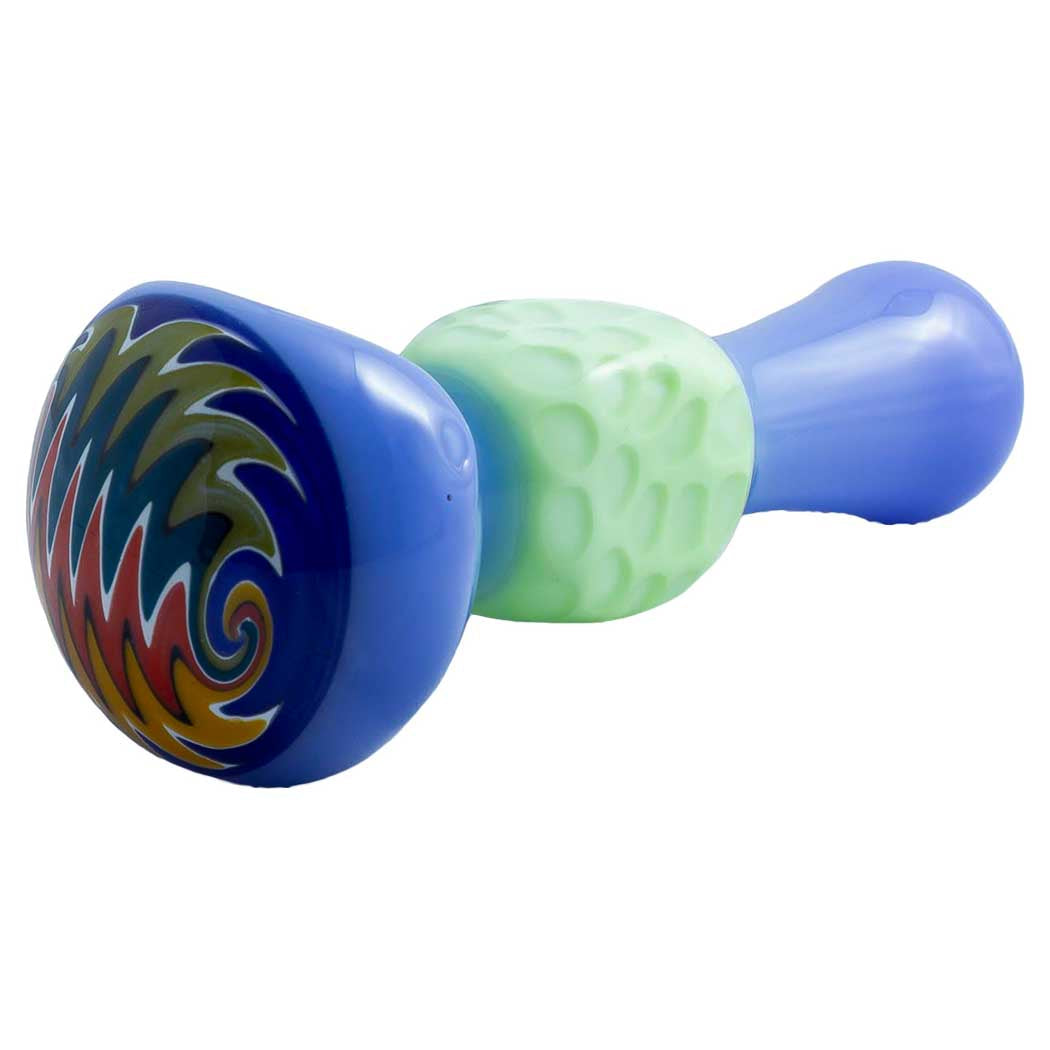 This 5" glass spoon hand pipe features a vibrant Slyme color wigwag top pattern and a honeycomb-textured body. It includes a left-side carb for precise airflow and rests on a 2" base with a 2" width for stable placement and comfortable handling.