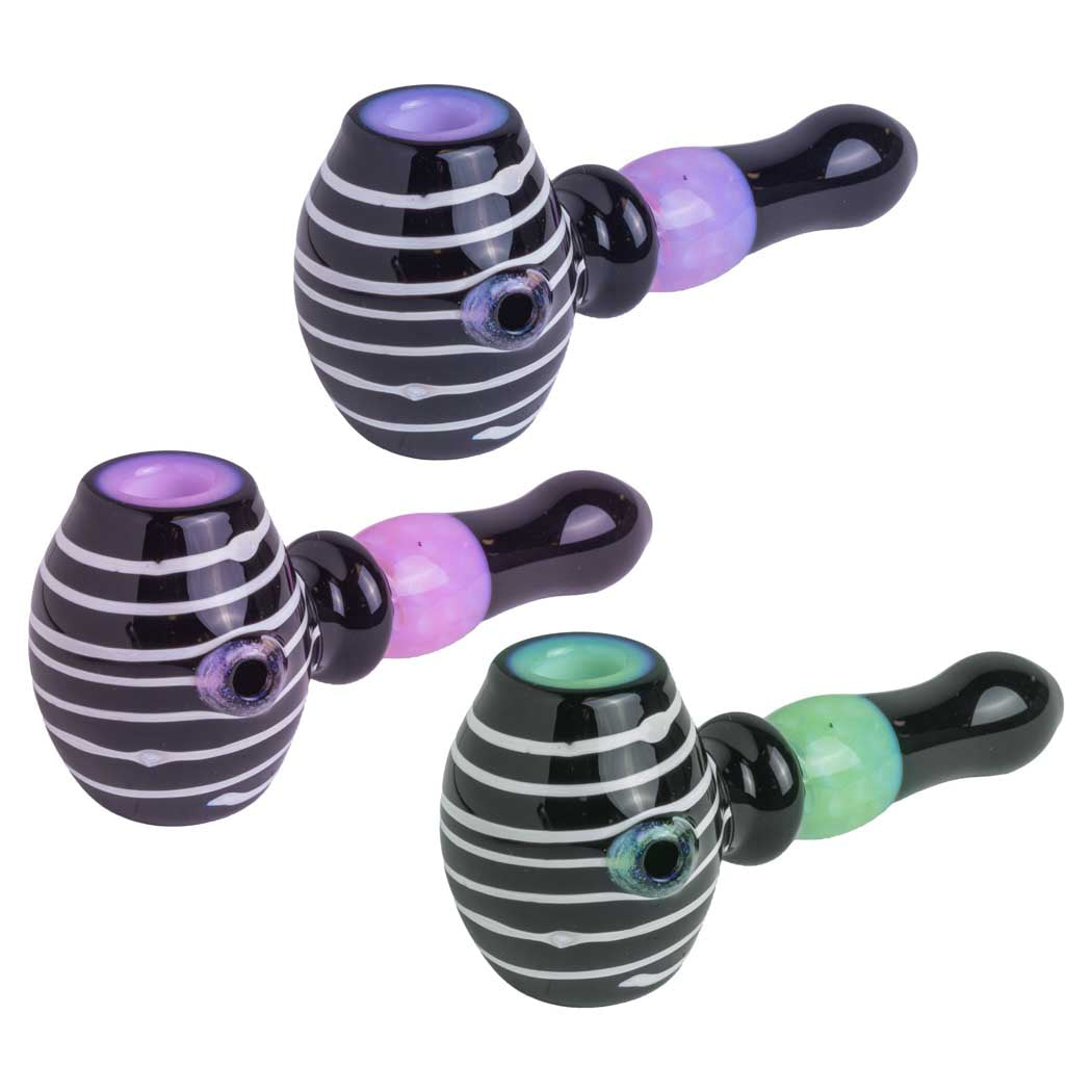 High-contrast black and white striping with colorful mouthpiece accents give this 5" spoon pipe a clean, modern look. It includes a built-in filter and a left-side carb for an easier draw.