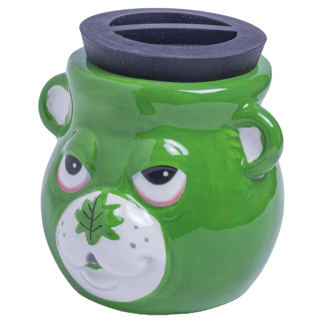 The 3" tall, 3.5" diameter ceramic stash jar comes with a rubber-sealed lid and three novelty animal-head designs: sunglasses dog, grumpy green bear and mischievous pink cat.