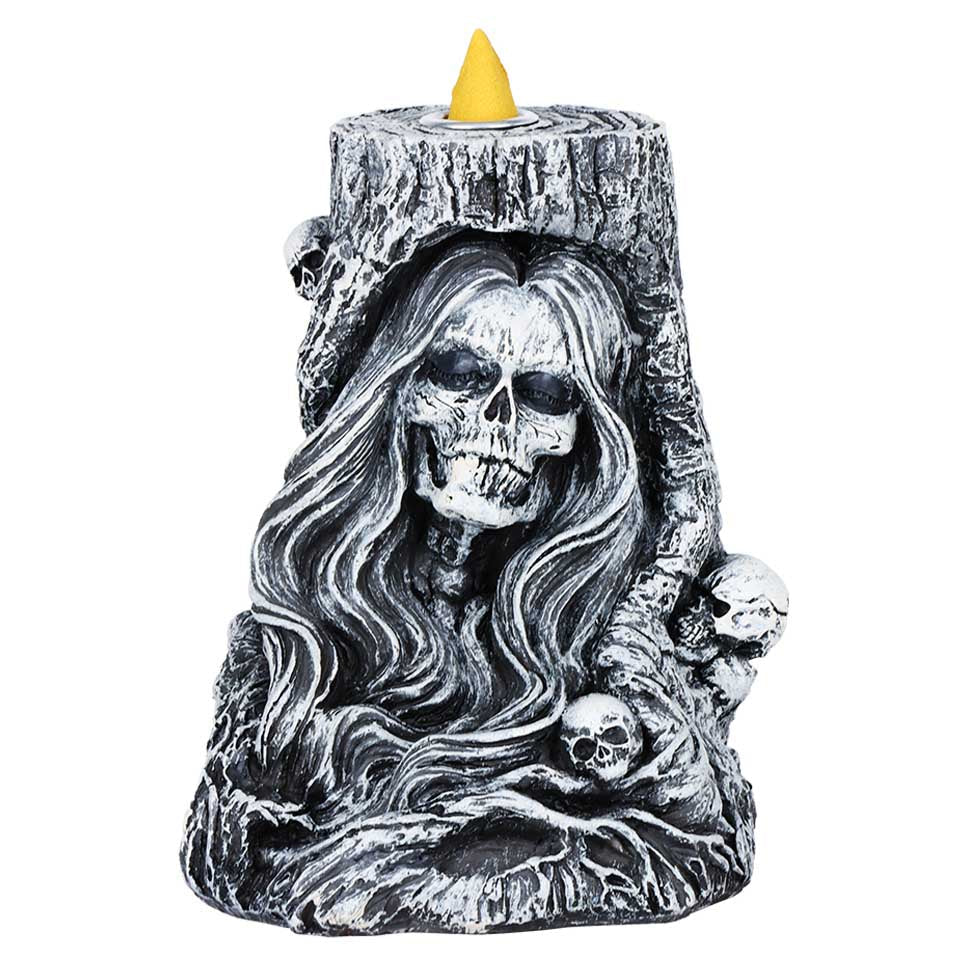 The Haunted Tree Of The Dead 6" polyresin backflow incense burner melds eerie artistry with slow, cascading smoke as a skeletal woman carved into a twisted stump seems to sigh with each plume, creating a haunting centerpiece for ritual or décor.