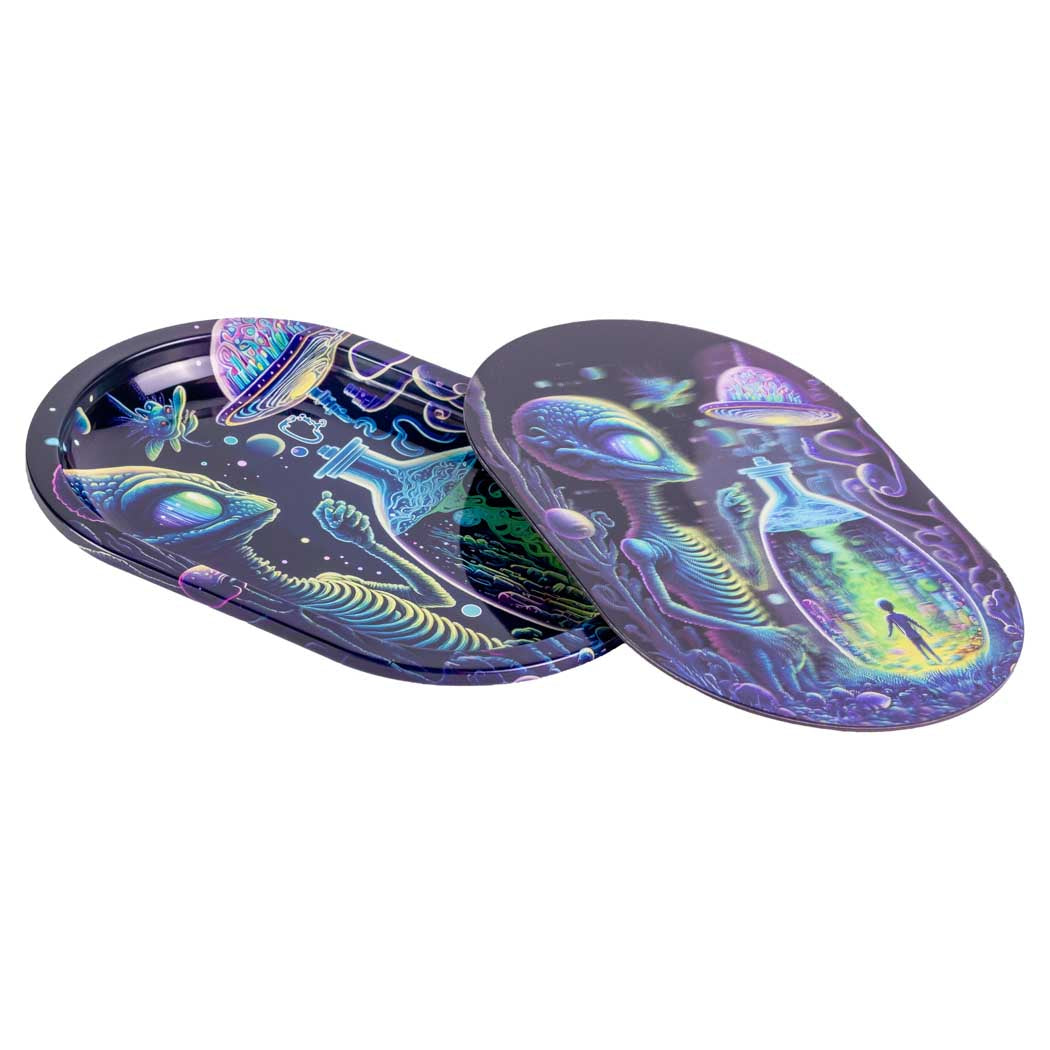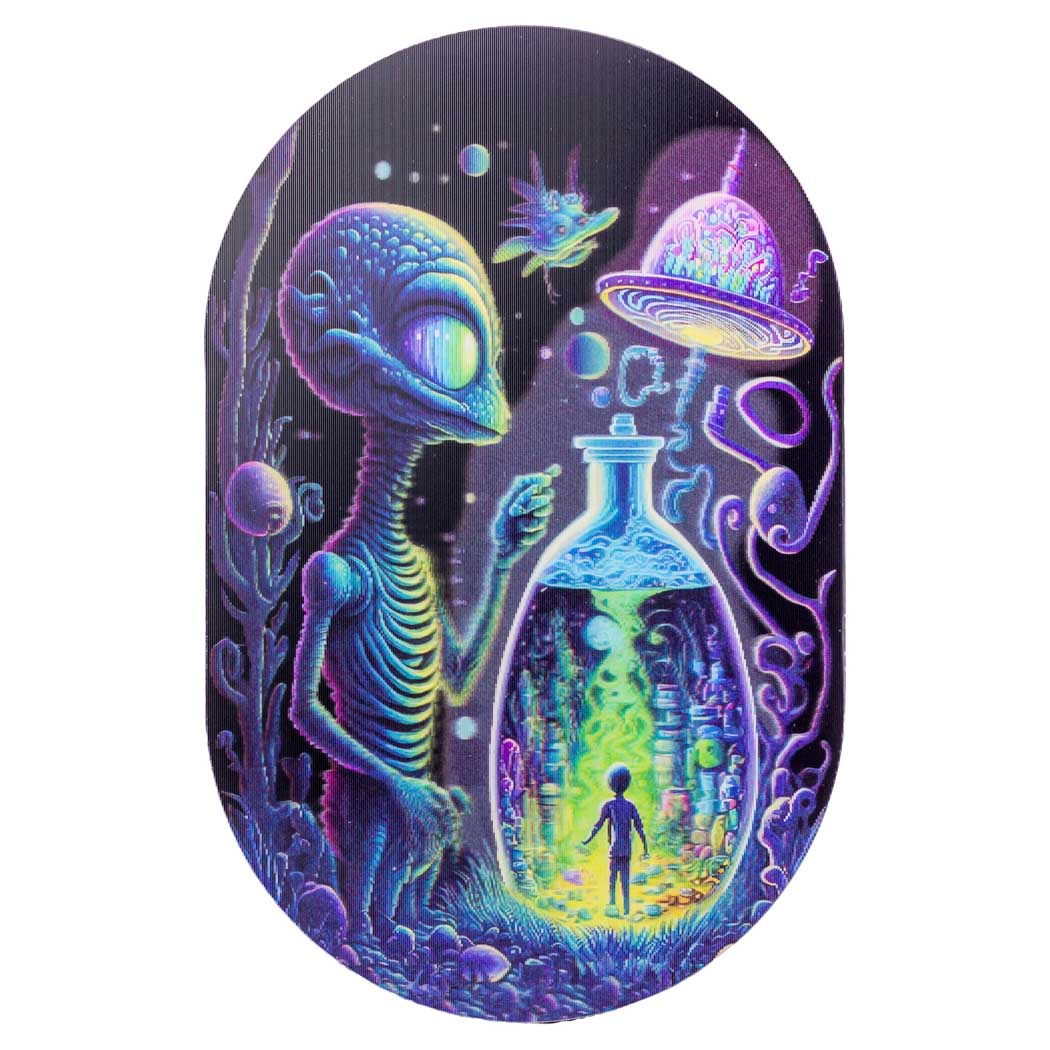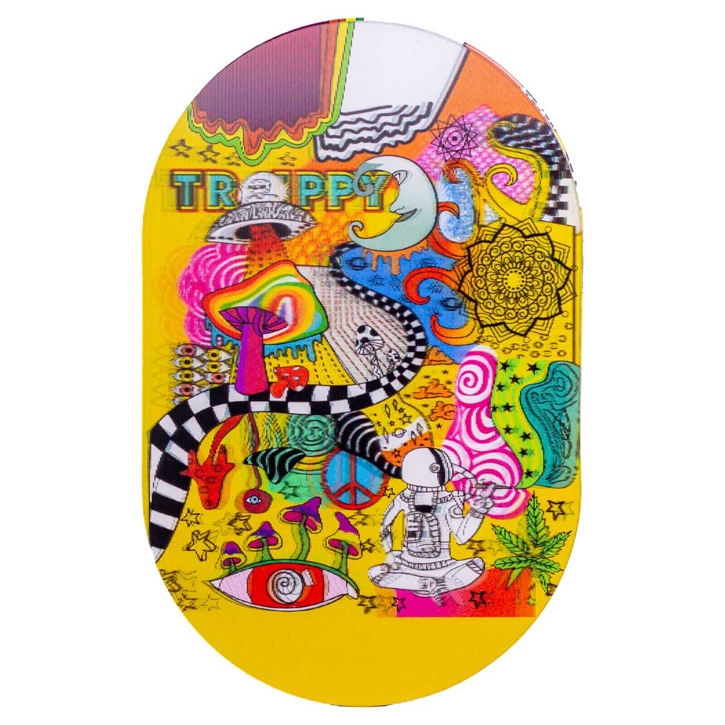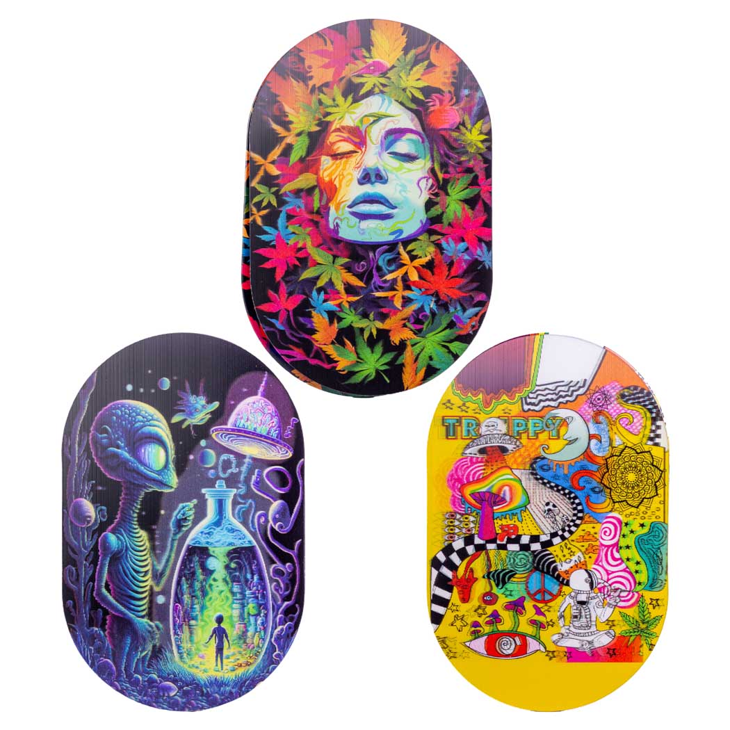 Tiny tray, big personality - this compact metal rolling tray snaps closed with a magnetic lenticular lid that shifts artwork as you tilt it, giving pop and protection in a pocket-sized package perfect for travel, gifting, or quick sessions.