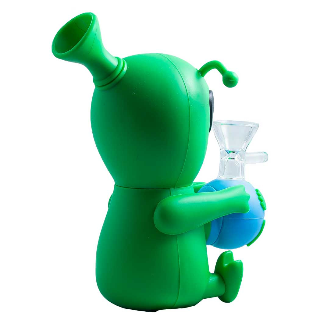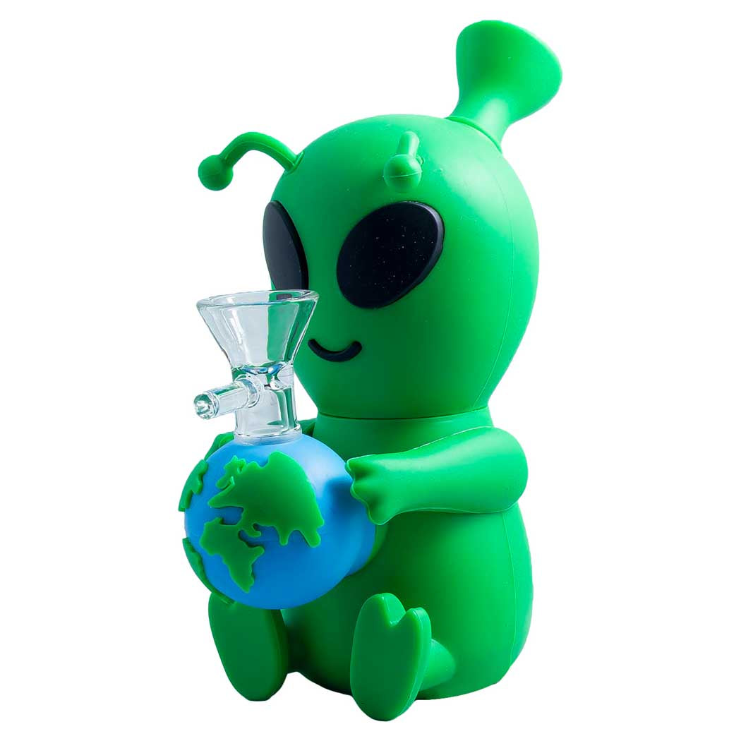 This 6" silicone water pipe depicts a friendly alien clutching a globe, with a top-mounted 14 mm joint slide and fixed downstem for smooth draws. The modular design disassembles easily for thorough cleaning, blending playful aesthetics with durable functionality.