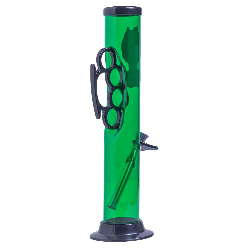 The Headway Designs Pack-a-Punch 12" straight acrylic water pipe packs a knockout punch with its sturdy acrylic build, ergonomic black knuckle duster grip, bold red “Smoky Things” flame graphic, and form-fitted silicone cap plug to prevent leakage.