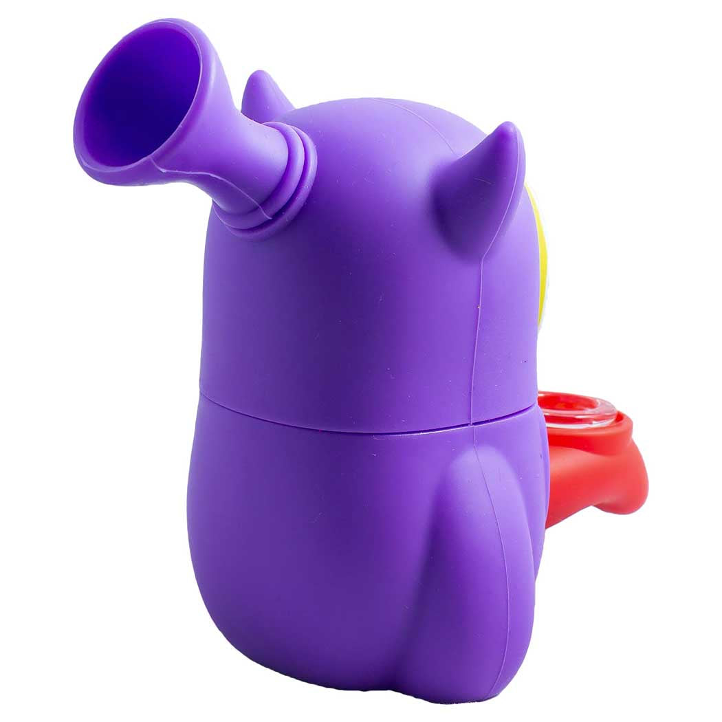 This 4.5" silicone water pipe features a whimsical one-eyed monster design with horn accents and its tongue serving as the removable slide. It includes a fixed downstem, an 18 mm joint slide, and a modular build that disassembles easily for thorough cleaning.