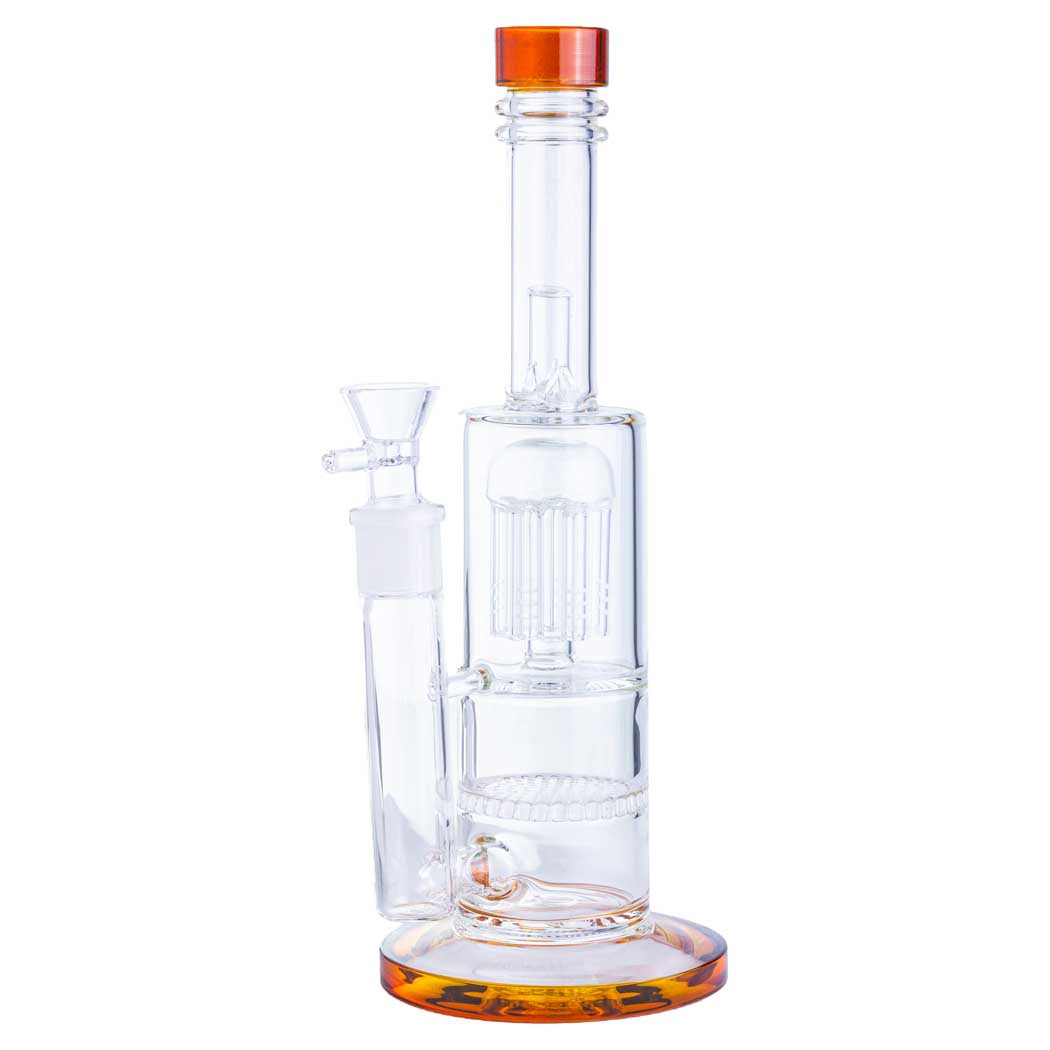 Engineered for advanced diffusion, the Tree and Honeycomb Dual Perc Cylinder 12" Glass Water Pipe combines an upper tree perc and lower honeycomb perc with vibrant color accents, a fixed downstem, and 18 mm joint on a 4.5" base for silky-smooth, cool draws.