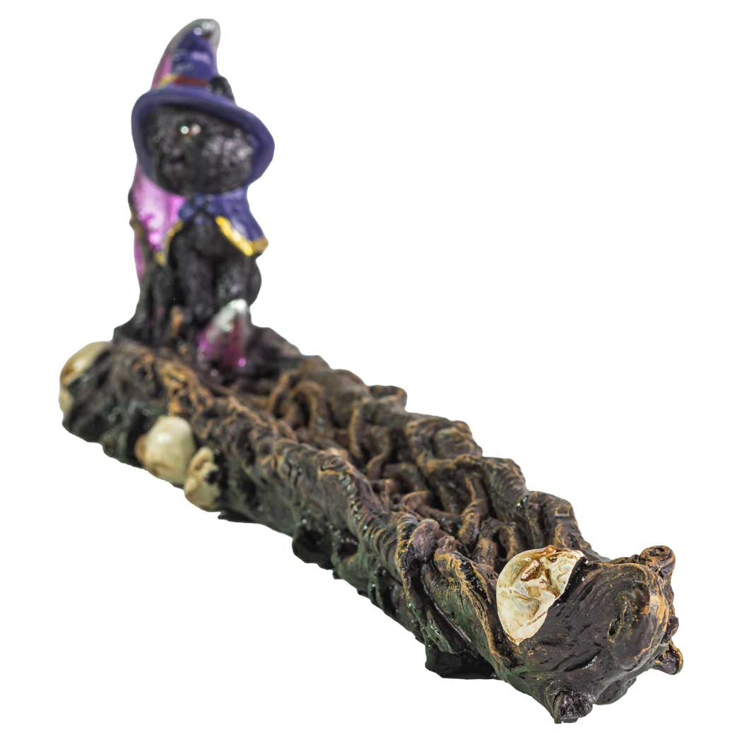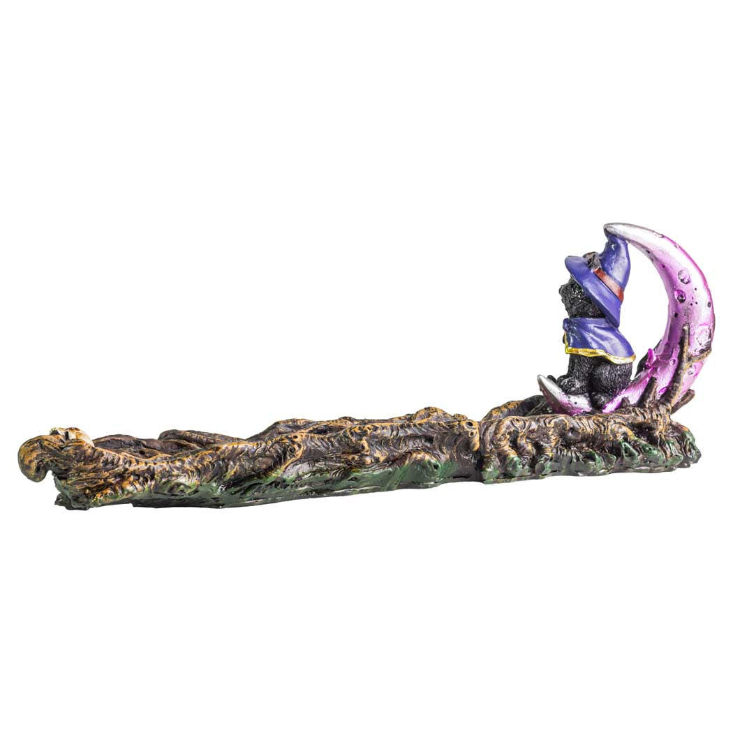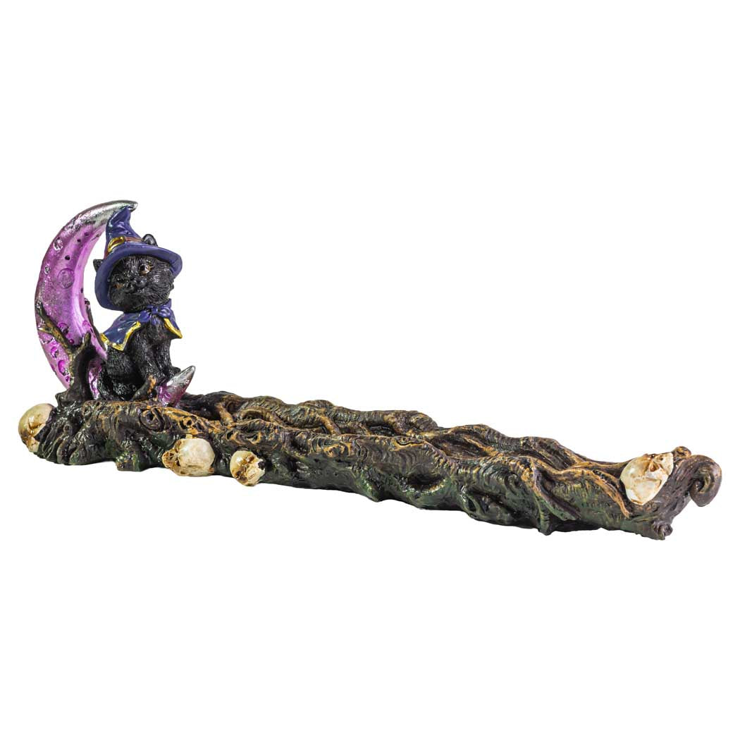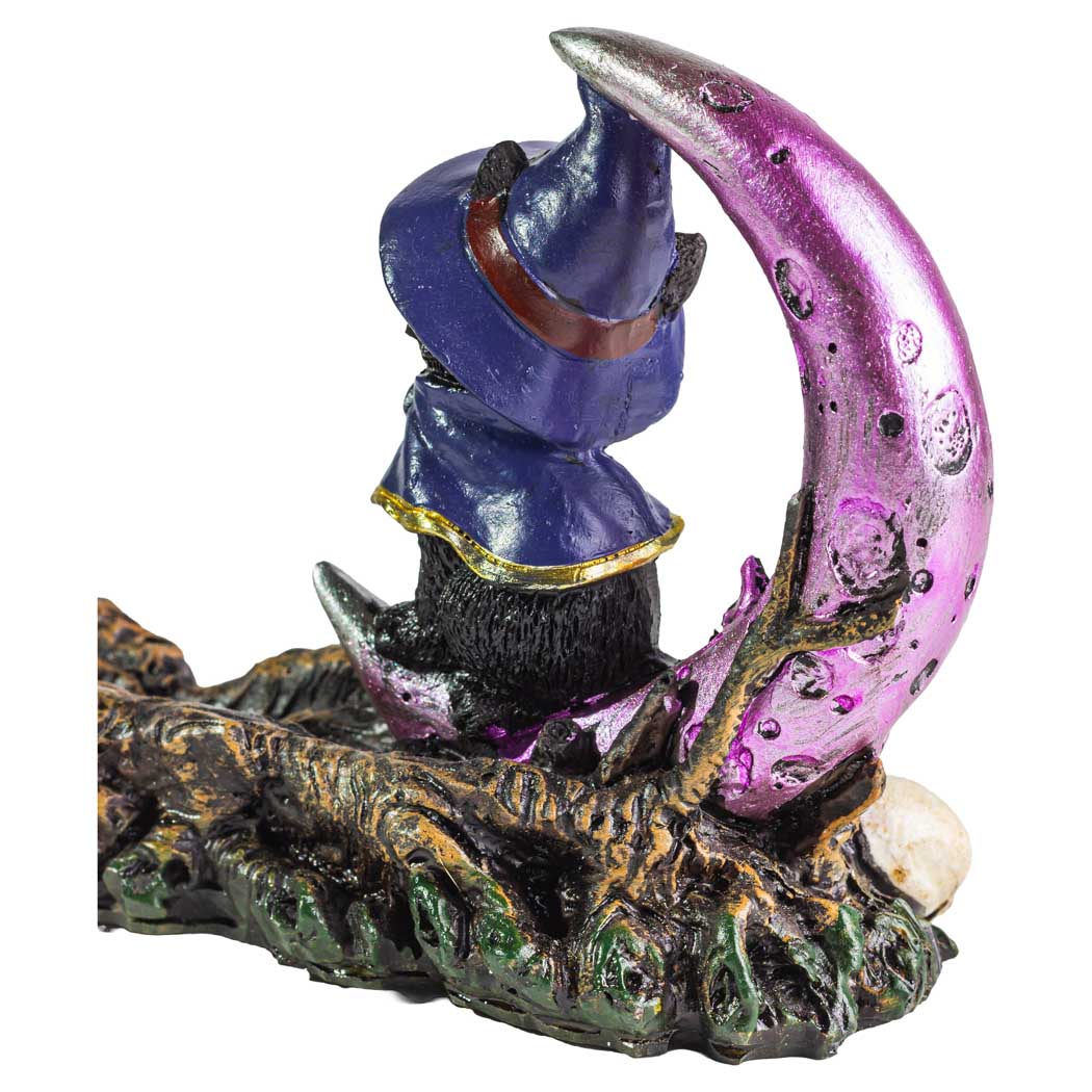 The Black Magic Cat 11.5" polyresin incense burner is equal parts mischievous and charming, featuring a witchy black cat in a purple hat beside a crescent moon atop a gnarled branch—ideal for adding a playful spooky accent while your incense burns.